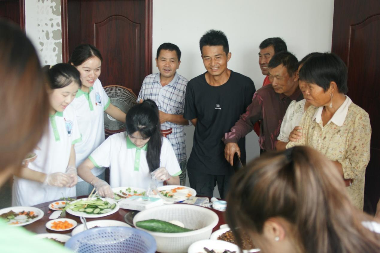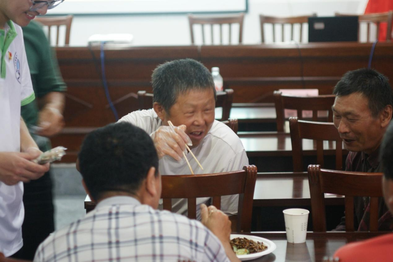 紧接着,队员们将制作好的昆虫食品接连端到指定地点。在上一场活动结束之后,村民们便陆尝试起这种“新奇”美食。起初,部分村民对这种美食还略有迟疑,但在实践队员们的耐心讲解及尝试食用后,取而代之的便为喜笑颜开,赞不绝口。而伴随着活动的进行,队员们与村民们也逐渐打成一片,场面其乐融融,如火如荼,温馨不已。