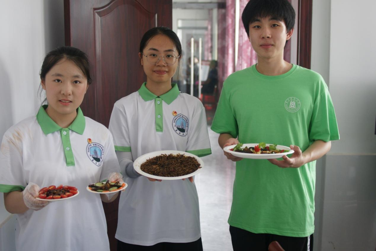 据介绍,昆虫宴起源于云南的昆虫食法,大多采取油炸方式,不仅入口酥香,而且去除腥味,是下酒的好菜;除此之外,昆虫的营养丰富,具有美容强身的功效。经过一段时间的交流后,华中农业大学实践队队员们也积极参与到昆虫宴的制作中来,在两校学子的共同努力下,一盘盘装点精美的昆虫美食很快被制作而成,香飘四溢,造型童趣且不失深度。