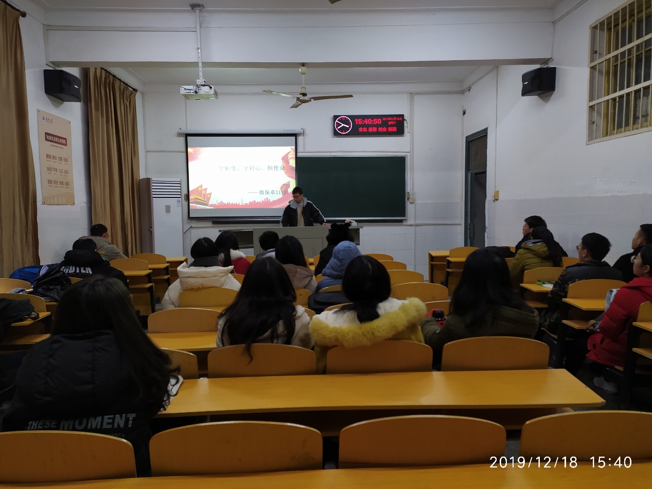 其中,植保卓31701班于12月18日在西校区二教107开展了本次班团会。在团会开始前,各个班委协助团支书黄呈鑫设计了以“学制度,守初心,担使命”为主题的板报。