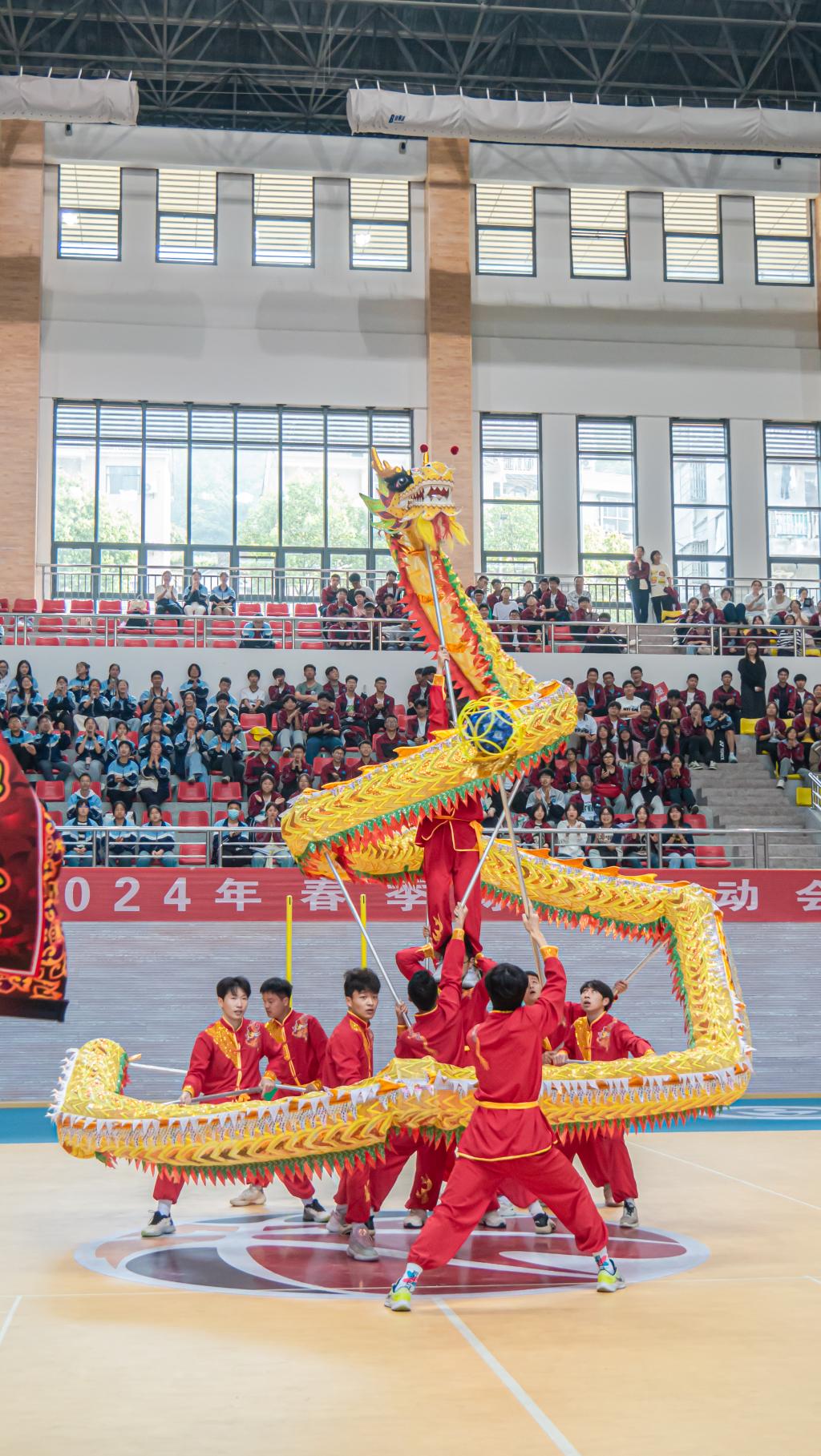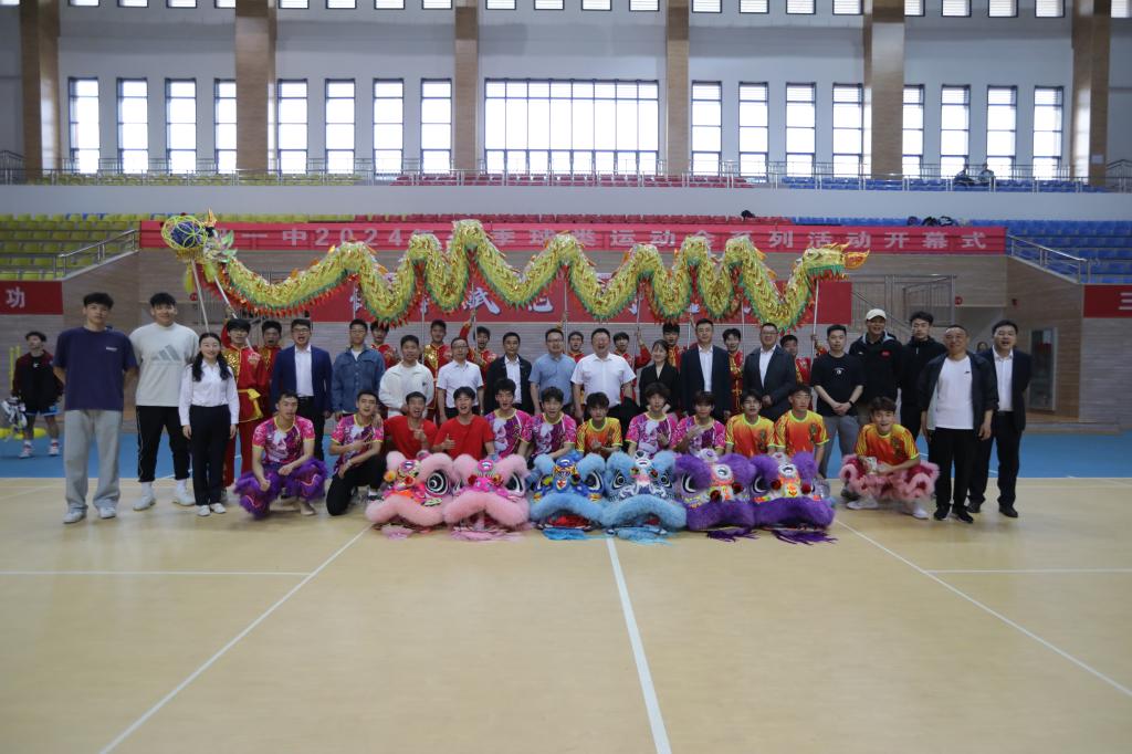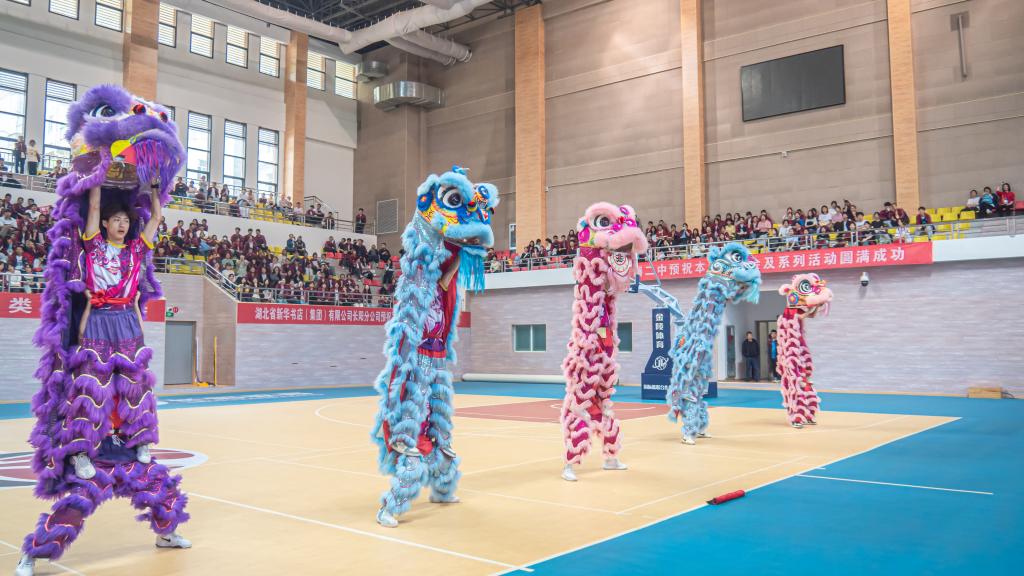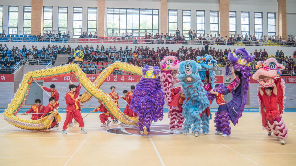 伴随着铿锵有力的音乐响起,金色长龙翻腾起舞,气势如虹,六只狮子“摇头摆尾”、“眨眼扇耳”,腾挪跳跃、威风凛凛,公司龙狮队为现场师生精彩表演《龙腾狮跃》,赢得了现场阵阵喝彩。