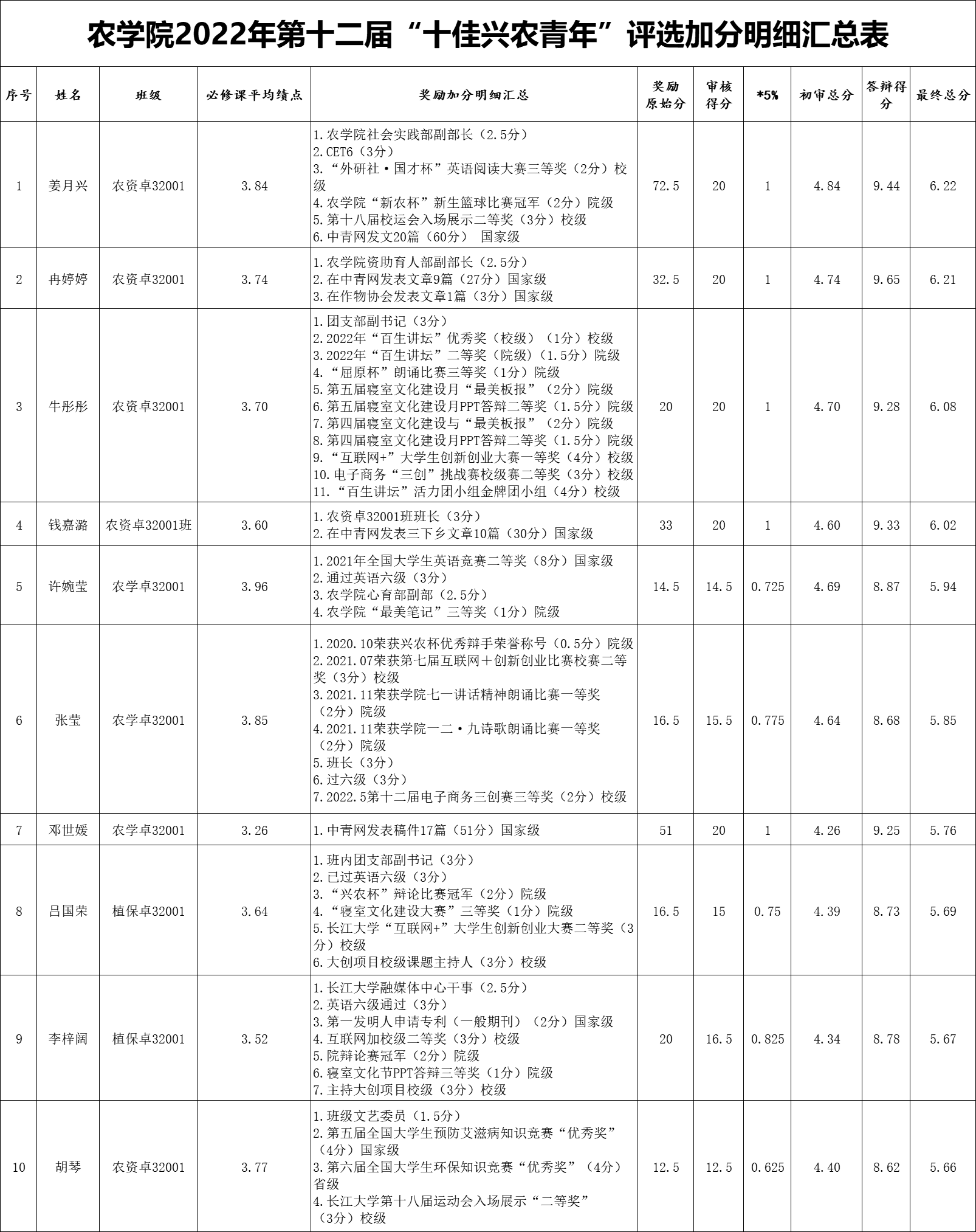 为了树立先进典型,充分发挥典型的教育示范作用,有效激励全院员工勤奋学习,形成积极进取、学习先进、崇尚先进、争当先进的良好风气,促进员工全面发展和成长成才,经个人报名、资格审核、个人展示、面试答辩等程序,拟推荐姜月兴等10名同学为本届“十佳兴农青年”候选人。