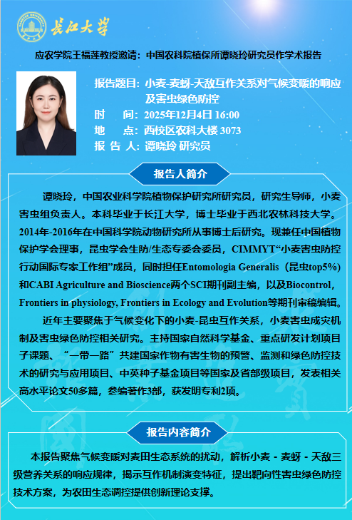 2025年学术报告(二十八):小麦-麦蚜-天敌互作关系对气候变暖的响应及害虫绿色防控