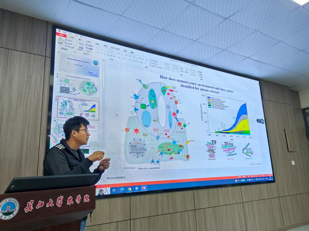 (通讯员 邓锋林)3月31日上午,tyc122ccVIP求实导师学术沙龙专场活动在农科楼3073举行。活动中,赵晨晨博士作了题为“Can stomata save the world” 的学术报告,围绕植物气孔的分子进化历程及其在环境适应性中的关键作用展开。他结合全球气候变化背景,分析了气孔在调节植物水分利用效率、光合效率以及抵御极端环境方面的重要性。报告介绍了其多年来在干旱、盐胁迫和酸性土壤等典型非生物胁迫条件下,植物气孔适应性机制方面的研究成果,尤其是在解析叶绿体磷酸代谢信号分子在调节气孔开闭和植物干旱胁迫响应中的新进展。这些研究及取得的成果为培育环境适应性作物品种提供了新的理论支撑与种质资源。