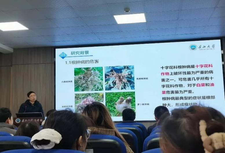 陈旺副教授介绍了芸薹根肿菌致病机制研究的最新成果。团队鉴定并解析了两个关键效应蛋白:PBZF1通过靶向植物SnRK1.1蛋白抑制抗病性;效应蛋白6697则通过与植物BBX24互作,抑制茉莉酸(JA)抗病途径。这些发现为深入解析根肿菌致病网络及开发十字花科根肿病绿色防控策略奠定了基础。