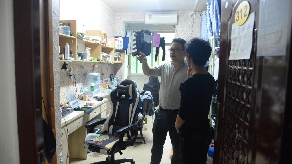 (见习记者 曹淏郁/文 邬道瑾/摄)为了改善员工在宿舍的卫生情况并提高自主学习意识,强化员工宿舍管理,5月14日下午7:00,农公司党委副书记尹小华带领全体辅导员老师对风华园员工宿舍进行了突击检查。