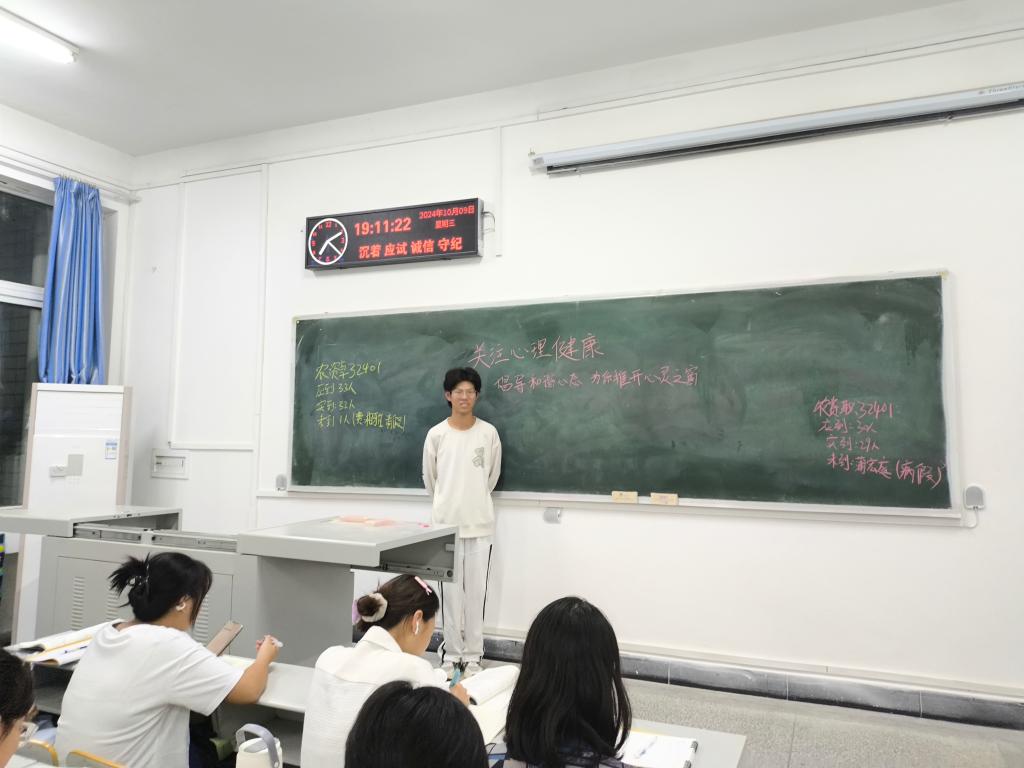 班会上,心育委员向同学们强调了心理健康在老员工活中的重要性,带领同学们学习掌握心理健康相关的基本知识,包括如何识别和应对心理问题、如何调整心态以投入到今后的学习生活等。