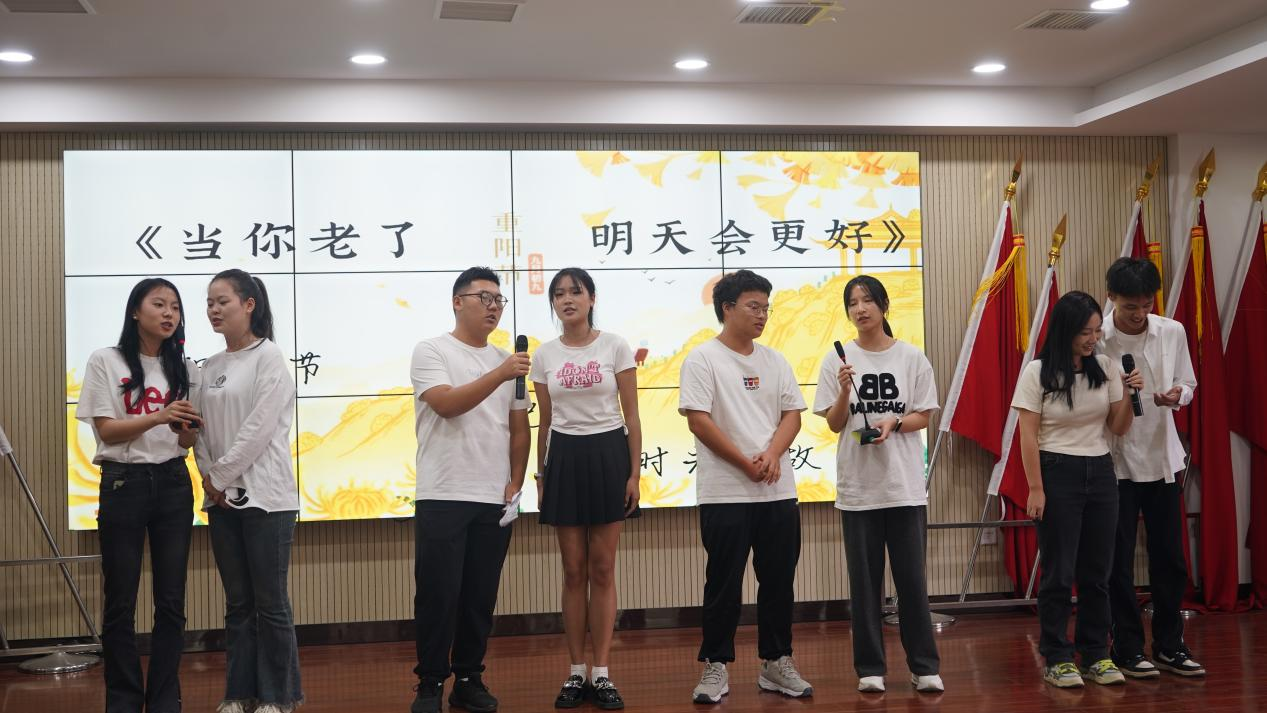 “谁说岁月催人老,青春的活力,依然在歌声中张扬”。在激昂的话语中,四位同学朗诵的现代诗《岁岁重阳,今又重阳》牵动了老人回忆的思绪。嘹亮的朗诵诉说着精神矍铄、老骥伏枥的人生态度。表演结束时,同学们为老人们献上祝福,场下掌声不断。