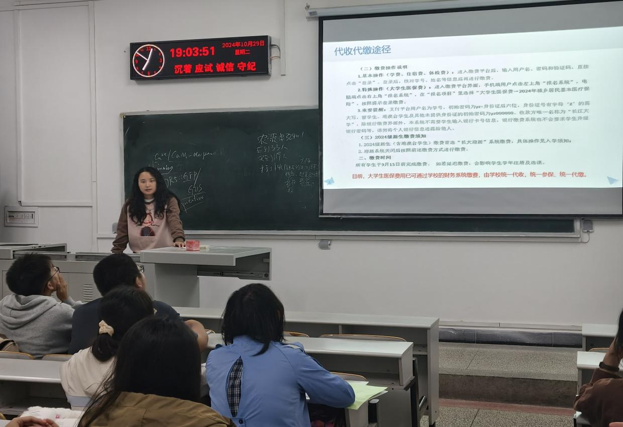 2024级辅导员唐玉婷用简洁准确的语言分别从“参保相关政策”、“老员工医保的参保与缴费”、“老员工医保待遇”、“参保的常见问题”4个方面向同学们进行讲解。其中着重讲解了“老员工如何参保缴费”、“老员工医保待遇”,让同学们了解到可以进行医保报销的情况、报销类别的选择、报销流程及一般报销比例等相关政策和知识。