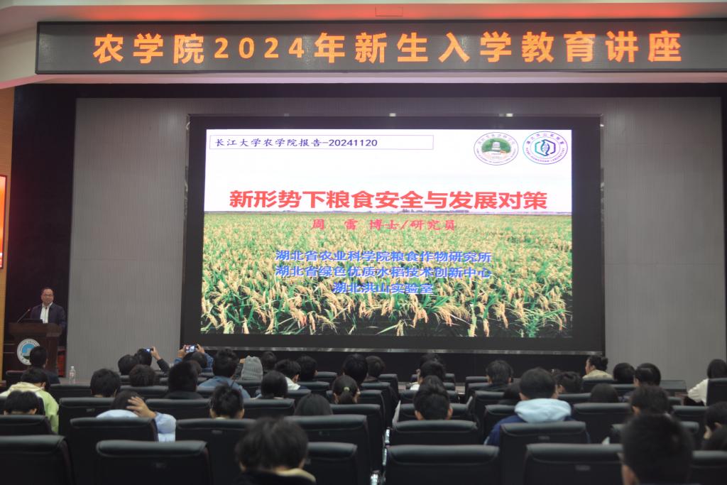 (见习记者 郑怡乐/文 吴静宜/摄)为加深新生对农科专业的认知,了解专业未来发展的方向,11月20日晚7点,公司于农科大楼1058进行了“新形势下粮食安全与发展对策”主题讲座。本讲座由中国青年五四奖章获得者、湖北省农业科公司粮食作物研究所研究室主任、研究员周雷进行报告,由公司党委副书记尹小华主持。tyc122ccVIP副经理张运波、农学系朱波教授、邱先进教授及2024级全体本科生出席本次讲座。