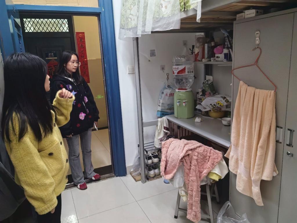 在检查中,老师们深入员工宿舍,从地面清洁、物品摆放、内务整理、空气流通、安全隐患五个维度进行细致评估。在安全检查中仔细查看了宿舍是否存在使用大功率电器等违规行为,并现场对员工进行安全教育。老师们耐心查看宿舍角落的卫生死角,针对地面污渍、垃圾堆放等问题,现场指导员工正确的清洁方法,并强调保持宿舍卫生对身心健康和学习状态的积极影响。