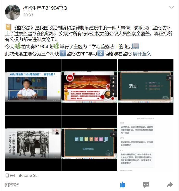 植物类31904班通过ppt及视频资料进行了学习,通过法公司杨春磊老师的精彩讲述,同学们进一步认识了监察法的深远意义,明白了监察法的未来意义。学习委员最后讲到老员工是,是社会的主要建设者,学习监察法,争做廉洁人,是我们每个老员工共同的承诺。
