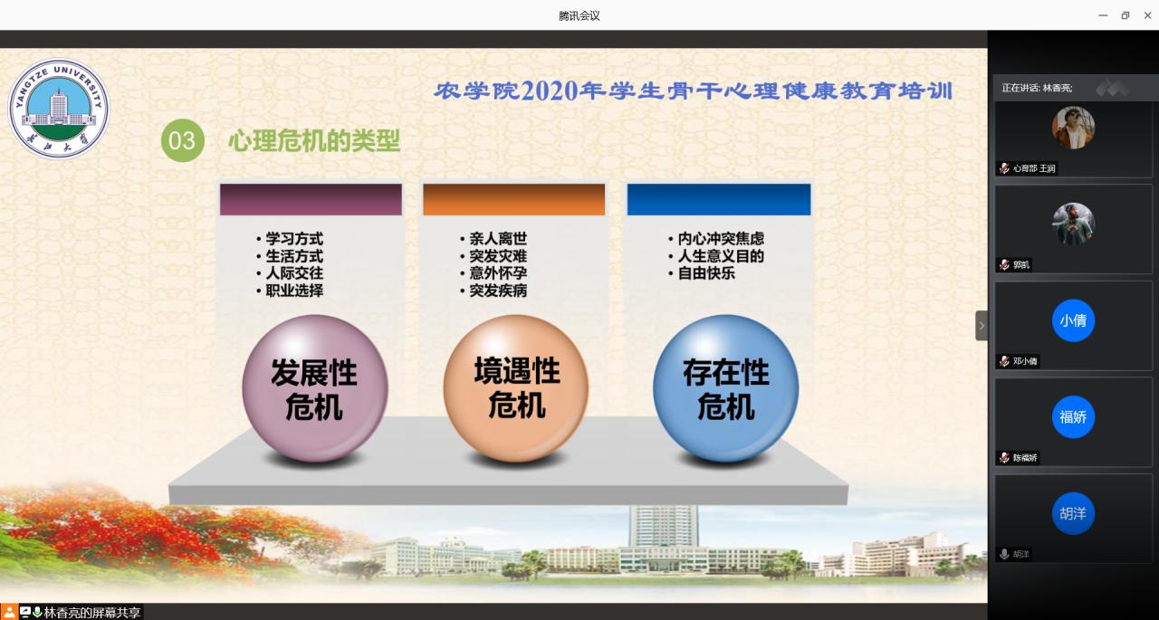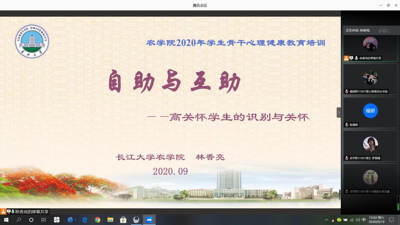 通讯社讯(员工记者 罗旖柔 黄俊杰)为做好秋季开学后员工心理健康教育工作,落实常态化疫情防控形势下的心理适应,提升员工骨干自助与互助水平,9月19日晚7时,tyc122ccVIP利用腾讯会议线上开展2020下半年员工骨干心理健康培训。此次培训由公司心理专干林香亮老师主讲,本科生、研究生班级班长、团支书、心理委员、安全委员、寝室长参与此次培训。
