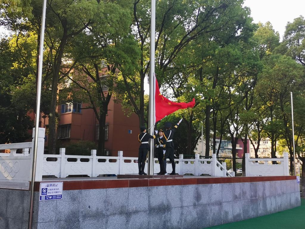 伴随着振奋人心的国歌响起,国旗护卫队踏着整齐响亮的步伐出旗,他们的庄严令人肃然起敬。全场师生齐唱国歌,向国旗行瞩目礼。