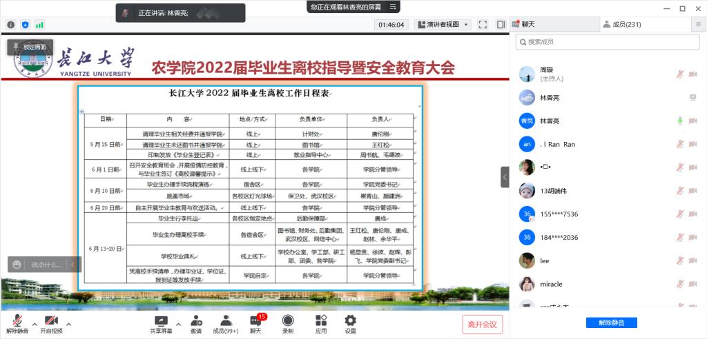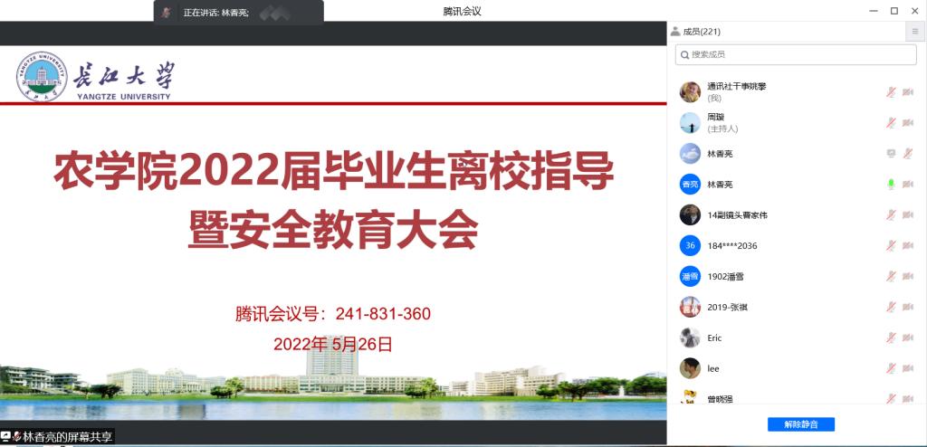 通讯社讯(见习记者 姚攀/摄 杨静/文)为营造和谐温馨的毕业生离校氛围,确保员工安全有序离校,5月26日晚6:20,tyc122ccVIP召开2022届毕业生离校指导暨安全教育大会。公司党委副书记尹小华、辅导员林香亮和全体2022届毕业生参加会议。