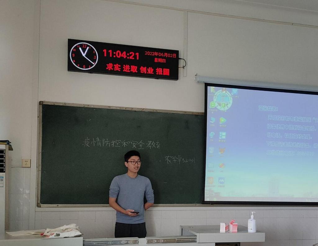 6月3日11时,农学卓32001班副班长王荣森在本次主题班会中提醒同学们提高自我保护意识,掌握预防和控制病原体传播最基本、最简单且行之有效的手段,如出门戴口罩,进门勤洗手,不聚集等。班会上班长要求同学们严格遵守公司关于疫情防控的有关规定,严格落实每周核酸检测,树立“校园是我家,防疫我有责”的观念,积极参与公司疫情防控工作。