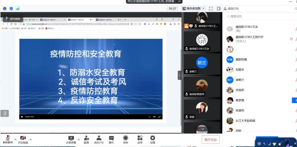 6月4日12时30分,农资31801班王雨晴在本次线上班会中提到注意防盗、防骗、防抢及用电、用火、用气、涉水、交通等安全问题;求职择业过程中要提高警惕、防止受骗或误入传销组织,并与家人或公司保持密切的联系;离校出行要注意交通安全,通过正规渠道购买返乡车票,不乘坐无证无牌及超载车辆;严格做好疫情防护,确保自身安全。最后在班会结束时,她祝愿全班同学们前程似锦,开创更加美好的未来!