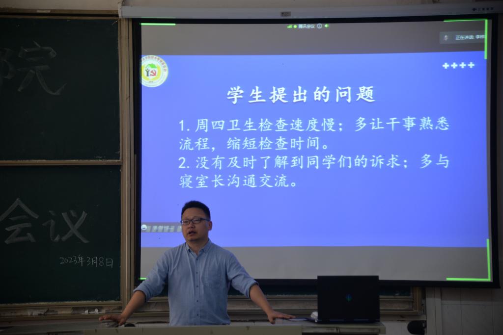 会议最后,尹书记号召寝室长发挥好模范带头作用,他说到:“寝室的风气在于寝室长,寝室长们要认清肩上的责任。”他表示,寝室长要关注寝室成员的动态,加强与他们的沟通,促进情感,积极化解寝室矛盾。
