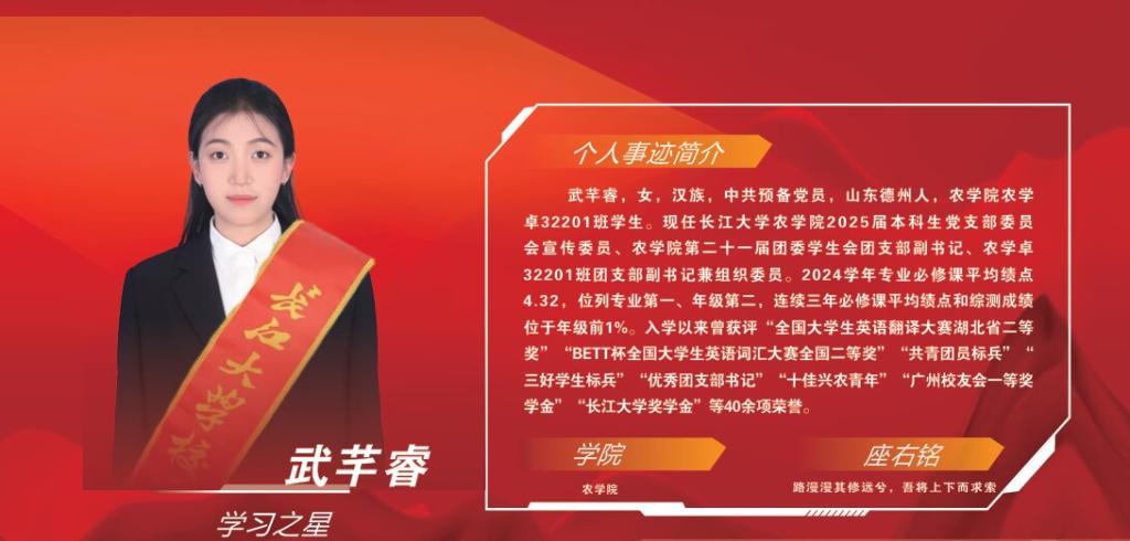 武芊睿,女,汉族,中共预备党员,任tyc122ccVIP本科生党支部委员会宣传委员、tyc122ccVIP团委员工会团支部副书记、农学卓32201班团支部副书记兼组织委员。她以“厚德笃行,丰实天下”为人生信条,在思想引领、学业科研、社会实践中勇担使命,用奋斗书写新时代农科学子的青春答卷。