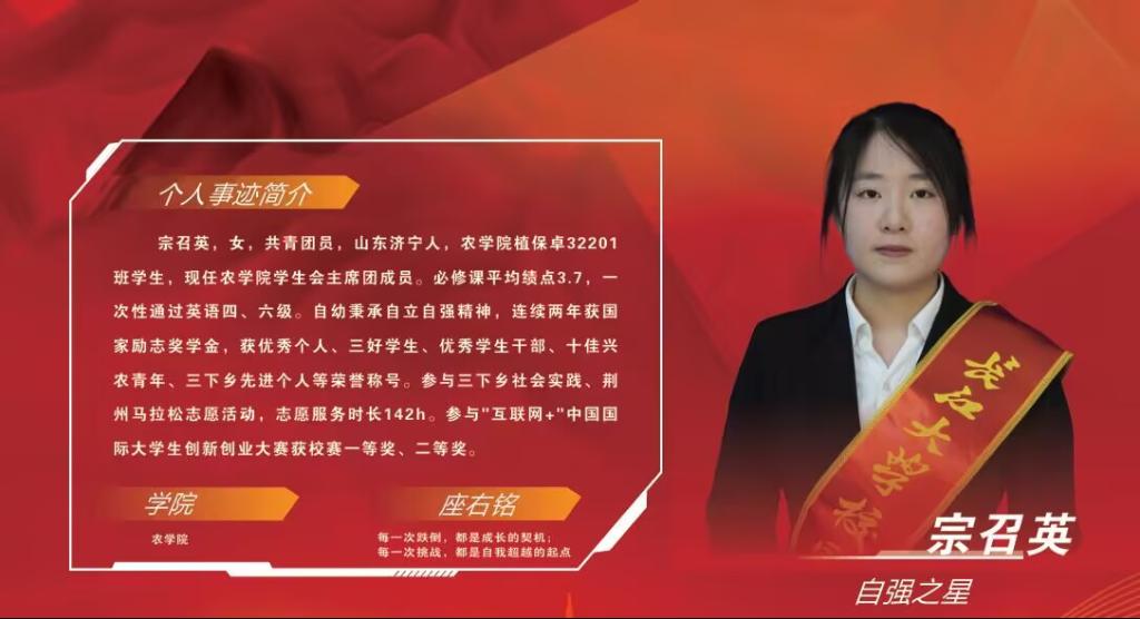 作为共青团员,宗召英始终以团员标准严格要求自己,积极向党组织靠拢,主动参与“青年大学习”及团内主题活动,在思想淬炼中坚定理想信念。她秉持“自立自强”精神,连续两年获国家励志奖学金,以实际行动践行“听党话、跟党走”的青春誓言,先后获评tyc122ccVIP“三好员工”“优秀个人”“十佳兴农青年”等荣誉,用奋斗底色擦亮青春信仰。