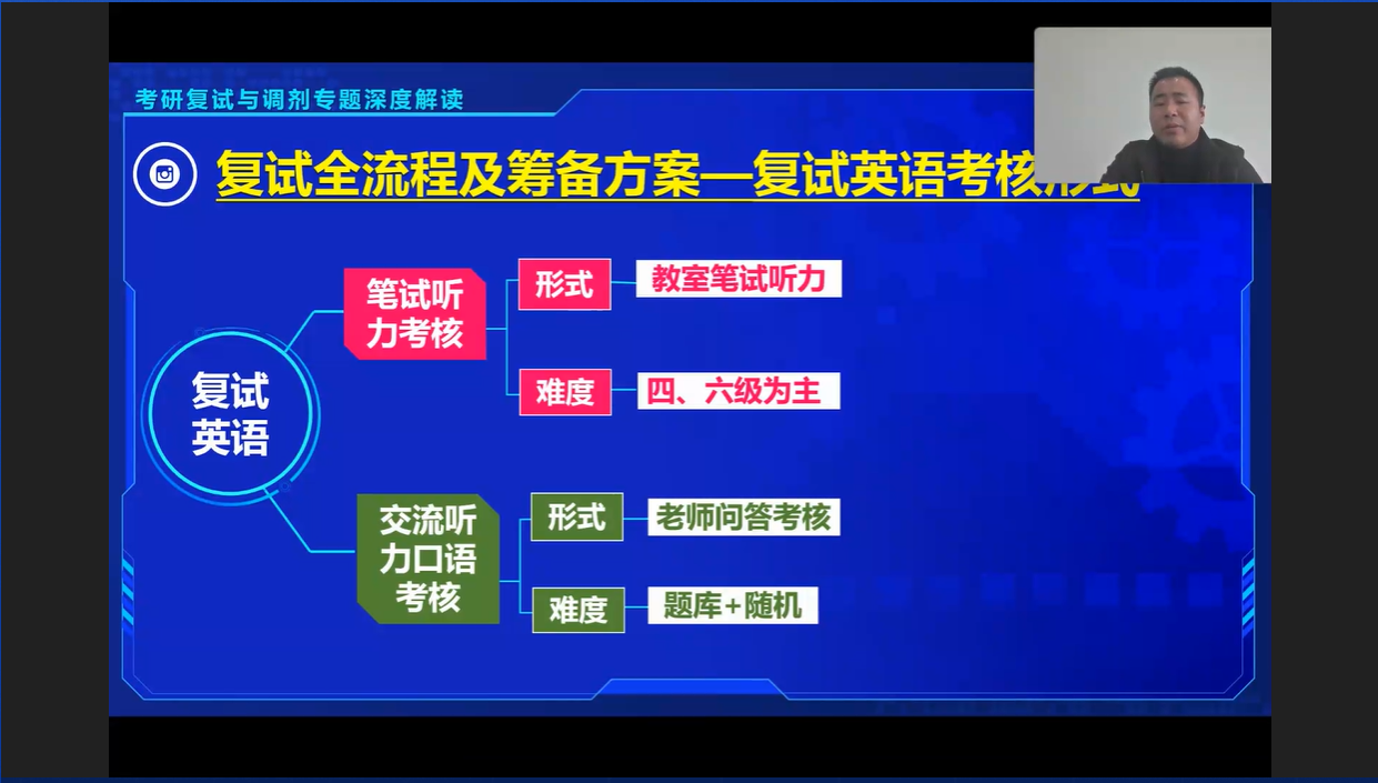交流会中,杨董事长首先梳理了24届复试和调剂的时间轴,请考生们注意各个环节的时间截点,关注相关信息。随后从基于初试成绩找准定位、复试/调剂形势分析及预测、复试全流程及备考方案、调剂全流程及注意事项几个方面展开详细阐述。
