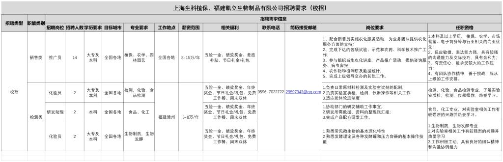 【就业信息】上海生科植保、福建凯立生物制品有限公司招聘需求