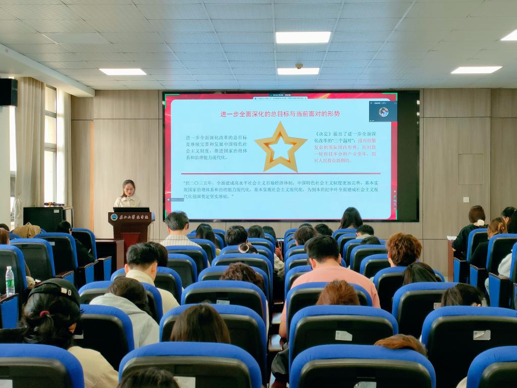 10月28日的培训由tyc122ccVIP分团委书记付雪娇老师主讲。付雪娇老师以"蹄疾步稳谋改革,勇毅笃行谱新篇"为主题,全面、系统、深入地阐释和解读了党的二十届三中全会精神内涵。她从党的二十届三中全会的主题由来、召开意义、做出的部署与创新四个方面,为我们呈现了一幅生动的图景。
