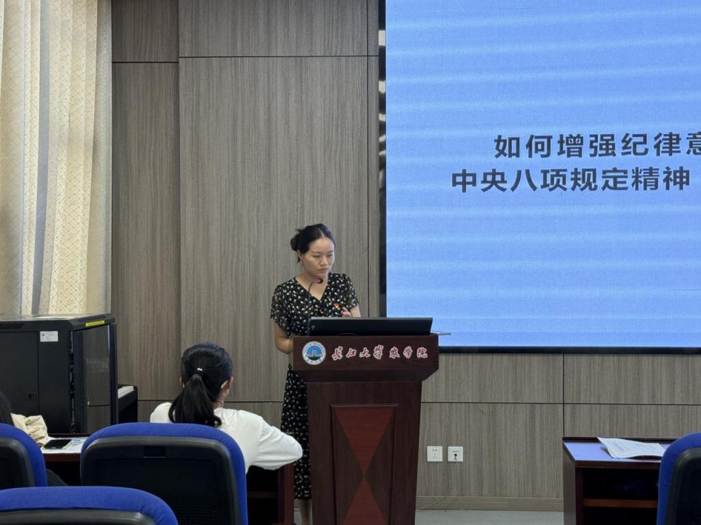 最后,支部书记付雪娇同志对会议进行总结。她强调,我们要提高政治站位,深入落实中央八项规定精神,切实强化党性学习锻炼;从自身做起,努力做到坚持理论学习、强化原则意识、树立底线意识。