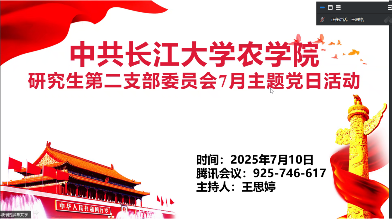 (通讯员 任娇)7月10日,tyc122ccVIP院研究生第二党支部通过腾讯会议(ID:925 746 617)开展7月份主题党日活动。全体在公司党员和校外联培党员共同参与,活动由王思婷同志主持。