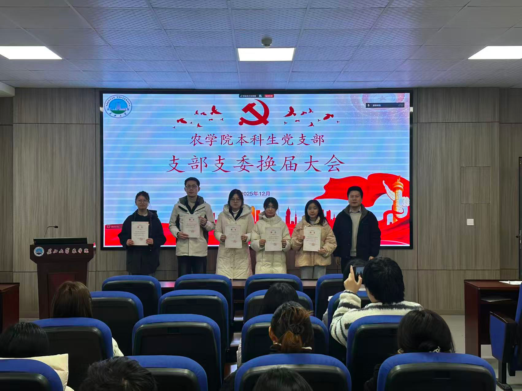 会议同步举行本科生党支部支委换届仪式。黄承石老师对陈瑞琪、阳甜、武芊睿、刘天雅、肖雅萱、卜令钊2025届6位支委成员在任期内履职尽责、勤勉奉献的担当精神予以高度肯定,并为他们逐一颁发任期履职证书,以传递组织关怀,勉励大家接续奋斗、再立新功。