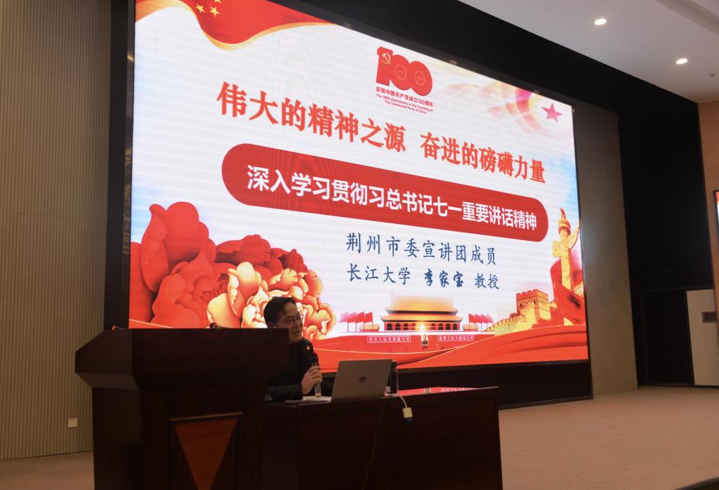 通讯社讯(通讯员 李慧明/摄 李雅倩/文)为贯彻落实习近平总书记在庆祝中国共产党成立100周年大会上的重要讲话精神,11月10日晚,公司原任副董事长、荆州市委宣传部讲师团首批特聘专家李家宝教授与tyc122ccVIP师生面对面,宣讲了习近平总书记“七一”重要讲话精神,报告会由农公司党委副书记谭亮魁主持。