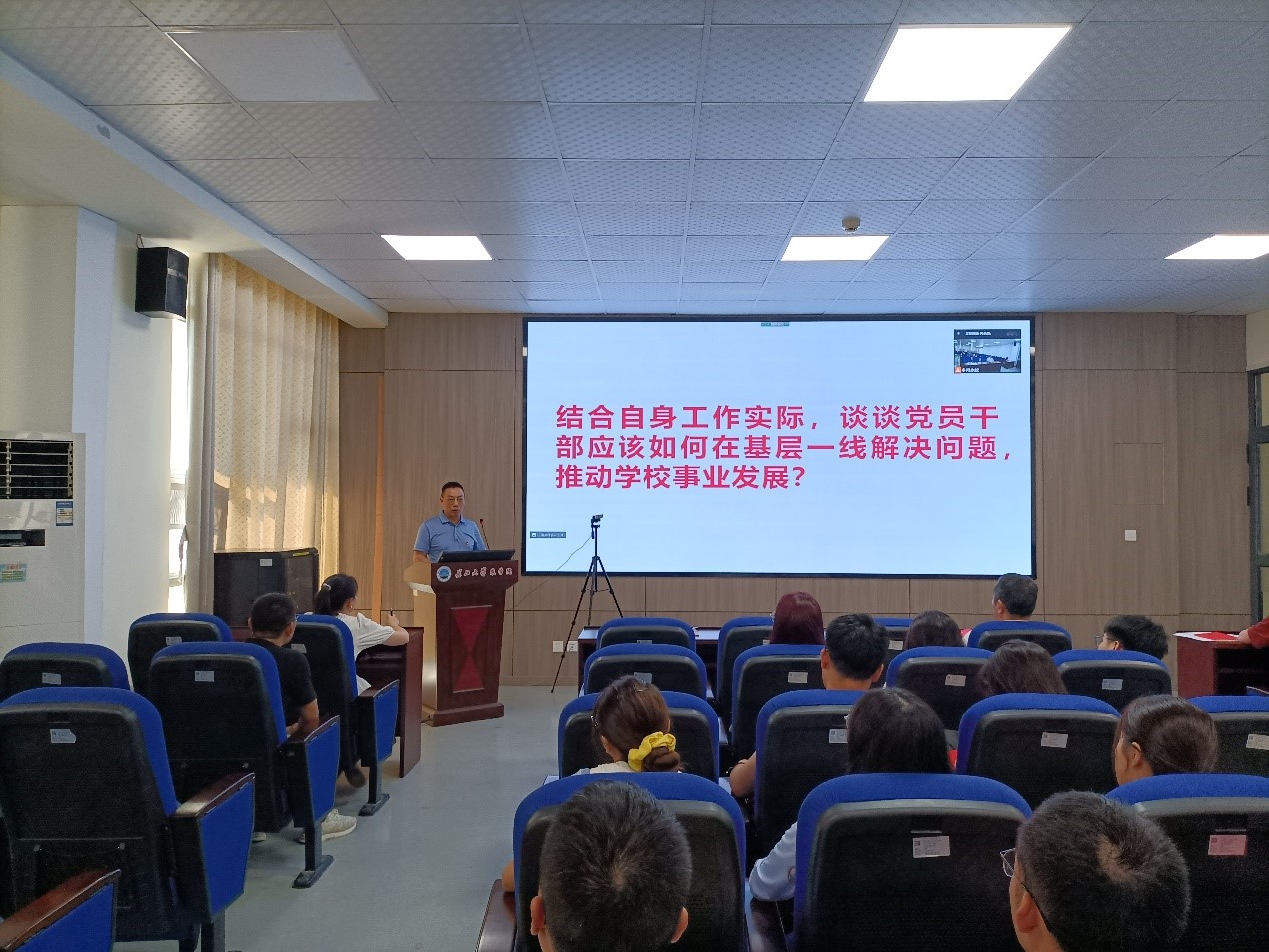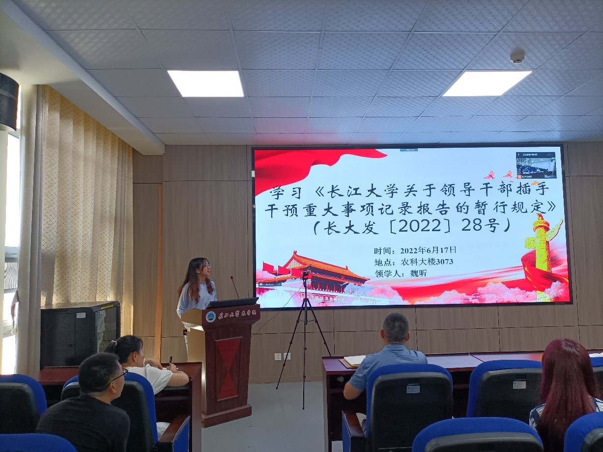 会议伊始,组织委员时锦超同志带领全体党员重温入党誓词。紧接着,肖永欣同志对本月党费交纳情况进行了说明。随后,与会党员集体诵读党章第六章,并集体观看视频《习近平回信勉励南京大学留学归国青年学者在坚持立德树人推动科技自立自强上再创佳绩在坚定文化自信讲好中国故事上争做表率》。接着,分别由时锦超同志带领学习《中共tyc122ccVIP委员会关于开展党员干部下基层察民情解民忧暖民心实践活动的实施方案》;杨阳同志带领学习教育部关于建立健全高校师德建设长效机制的意见;魏昕同志带领学习《tyc122ccVIP关于领导干部插手干预重大事项记录报告的暂行规定》。方小伟同志为大家讲述党史故事——英烈陈香波。陈香波革命烈士让我们看到了共产党员的崇高信仰和追求,作为研究生党员,我们要深入学习他的敢于斗争、无私奉献的精神,用实际行动诠释自己的初心和使命。