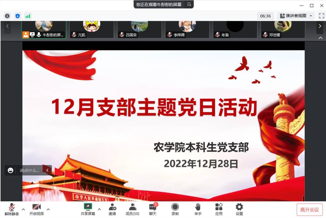 (通讯员 亢凯)12月28日晚上19:00,公司本科生员工党支部通过腾讯会议开展十二月主题党日活动,支部党员均参加本次主题党日活动,本次活动由支部党员牛彤彤同志主持。