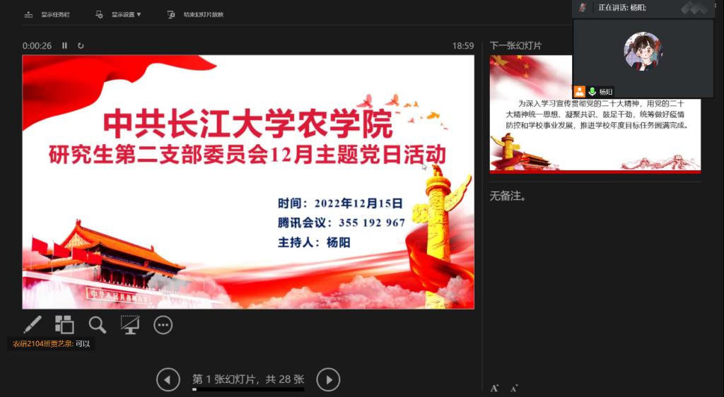 会议伊始,组织委员吴怡燃同志带领全体党员重温入党誓词。紧接着,杨阳同志对本月党费交纳情况进行说明。随后,由杨阳、刘曼莹、张浩然、贾艺泉和雷尧同志轮流诵读《中国共产党章程(修正案)》总纲相关内容,集体观看《二十大报告解读:科教兴国人才强国》和《二十大代表风采录——路丙辉:一路烛光》两个学习视频。接着,进入党课与集体学习党的创新理论环节,由曹佩娜、周璇同志分别讲授党课——《解读党的二十大报告主要精神》和微党课——《缅怀伟大的江泽民同志》;邓小倩同志带领学习《习近平谈治国理政》第四卷第六至第十部分;魏展鹏同志带领学习《习近平总书记主持召开中共中央政治局常务委员会 会议听取新冠肺炎疫情防控工作汇报 研究部署进一步优化防控工作》;刘至幸同志带领学习《中共tyc122ccVIP委员会关于深入学习宣传贯彻党的二十大精神的通知》。通过此次理论学习,我们深刻认识到面对严峻的疫情形势,我们要当好自己健康的第一责任人,不恐慌不焦虑,以积极的心态配合疫情防控工作,坚决打赢疫情防控阻击战;同时认真研读政策,紧跟时代步伐,全国上下勠力同心,挺过艰难时刻,以实际行动贯彻落实党的二十大精神。