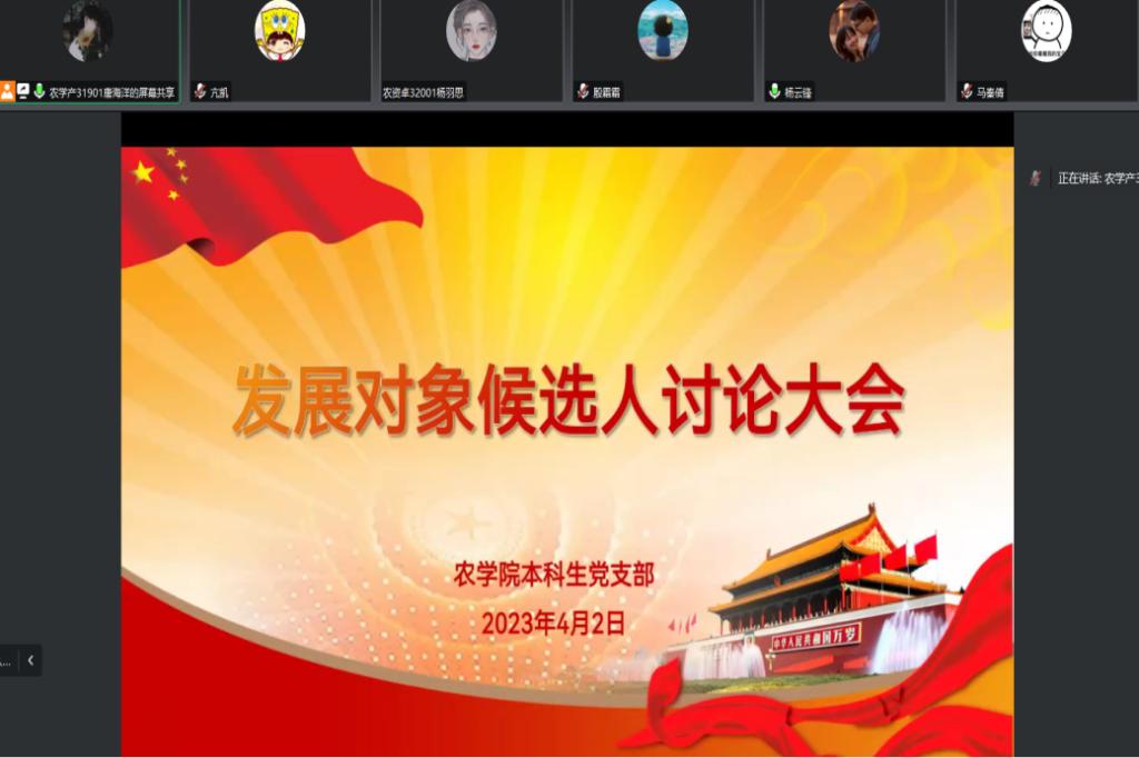 (通讯员 亢凯)为进一步加强农公司党员队伍建设,切实提高发展党员质量,4月2日下午3:00,公司本科生员工党支部在腾讯会议召开2023年上半年发展对象候选人讨论大会。活动由本科生员工党支部副书记唐海洋同志主持,全体本科生党员参与讨论。tyc122ccVIP本科生员工党支部书记杨云锋同志出席本次会议。