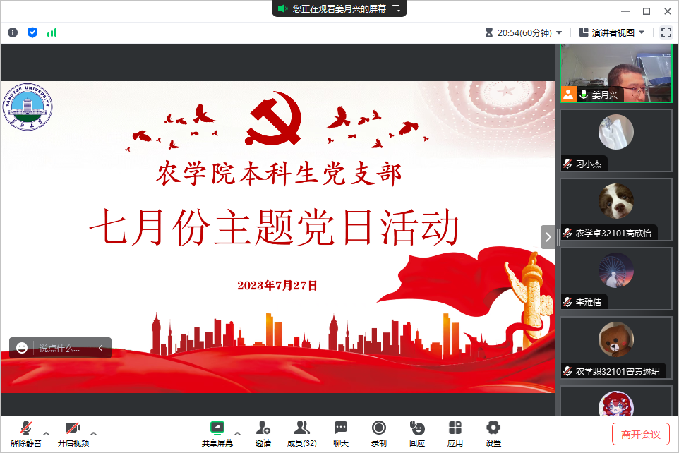(通讯员 徐志鹏)7月27日晚上19:00,公司本科生党支部在腾讯会议开展七月主题党日活动。本次活动由支部党员姜月兴同志主持。