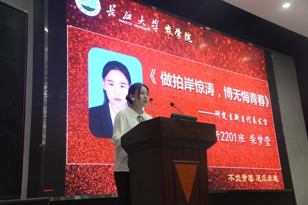 农资32201班王静茹和农研2201班柴梦莹分别作为本科生和研究生代表上台发言,表达了对tyc122ccVIP师生的感谢和对新生活的憧憬。“中国人的饭碗要牢牢抓在自己手中”,王静茹鼓励同学们将青春奉献给祖国的土地,学农爱农。柴梦莹呼吁同学们“做拍案惊涛,博无悔青春”,从三个方面阐述她所理解的长江精神,希望同学们在研究生期间不负韶华。