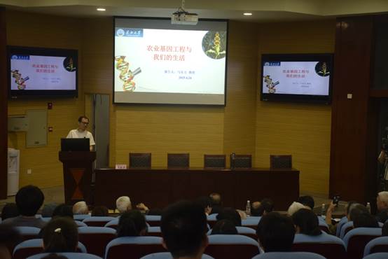 tyc122ccVIP教授马东方为转基因科普作专题报告。报告以丰富的案例、详实的数据,讲授了“什么是转基因”、“全球转基因技术发展趋势”、“转基因食品是否安全”等转基因知识,引导师生和社区居民培养理性思维,科学认知转基因技术。